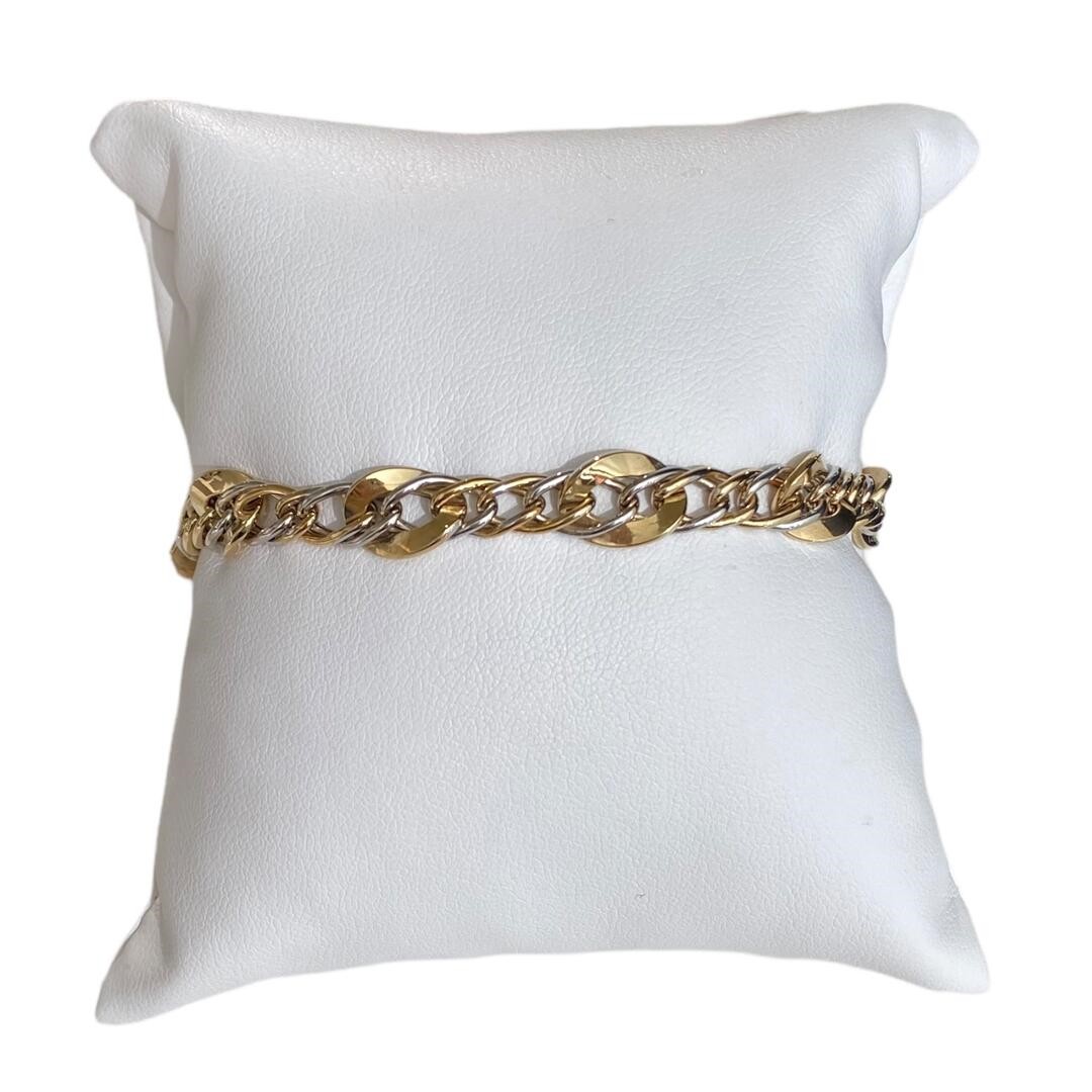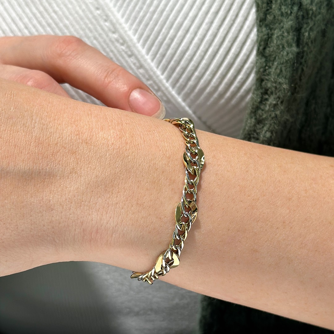 Dieses verspielte Armband aus 585er Gelbgold und Weißgold besticht durch sein luftiges, flächiges Design, das gleichzeitig modern und zeitlos wirkt. Trotz seiner markanteren Optik ist das Armband überraschend leicht und schmiegt sich sanft und angenehm an das Handgelenk an – ideal für den täglichen Tragekomfort. Die Kombination aus warmem Gelbgold und kühlem Weißgold sorgt für einen feinen Farbkontrast, der das Schmuckstück lebendig und vielseitig kombinierbar macht. Mit einer Länge von 19cm passt das Armband auf viele Handgelenke – auf Wunsch kann es selbstverständlich gerne gekürzt werden. Ein elegantes Accessoire für alle, die auffälligen, aber dennoch leichten Schmuck lieben.