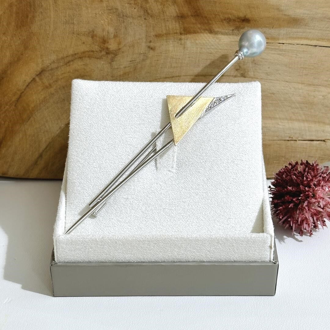 Diese ausdrucksstarke Brosche aus 585er Gelbgold und Weißgold verbindet klare Linienführung mit eleganter Raffinesse. Mit einer Länge von 11cm ist sie ein markantes Schmuckstück, das bewusst auf Struktur setzt: Die geometrische Komposition aus Stabform und überlagertem Dreieck verleiht der Brosche eine moderne Präsenz. Für einen lebendigen Kontrast sorgen die schräg darüber gesetzten, funkelnden Brillanten, die in Weißgold gefasst sind und das Design dezent auflockern. Eine graue Akoyaperle bildet den ruhigen Gegenpol zur klaren Formgebung und bringt eine weiche, schimmernde Note ins Spiel. Ein besonderes Schmuckstück für alle, die klare Formen und edle Materialien in spannender Kombination schätzen.