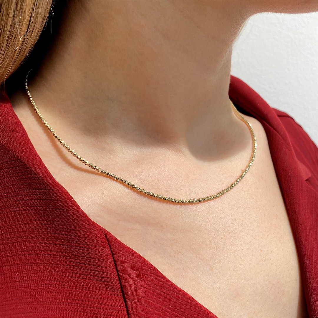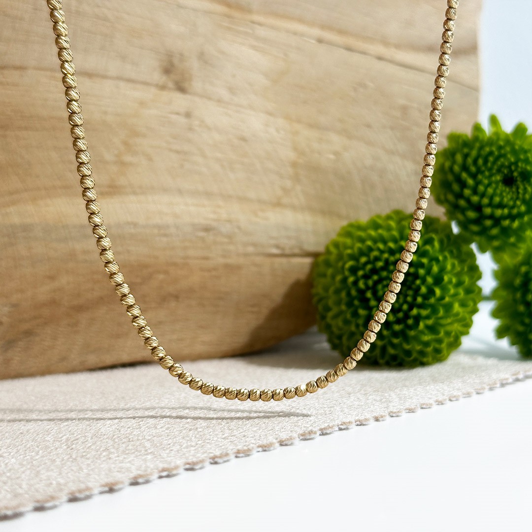 Diese Goldkette aus 585er Gelbgold besteht aus kleinen diamantierten Kugeln, die dem Halsschmuck eine verspielte und funkelnde Note verleihen. Das raffinierte Design sorgt dafür, dass die Kette bei jeder Bewegung glitzert und Aufmerksamkeit erregt. Ob für sich selbst oder als Geschenk für einen besonderen Menschen, diese Goldkette wird sicherlich Freude und Eleganz bringen. Die Länge der Kette beträgt 45 cm.