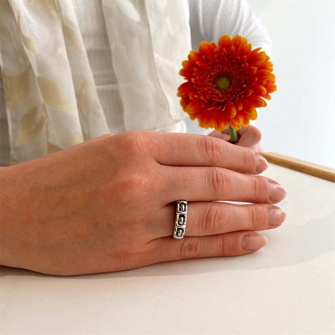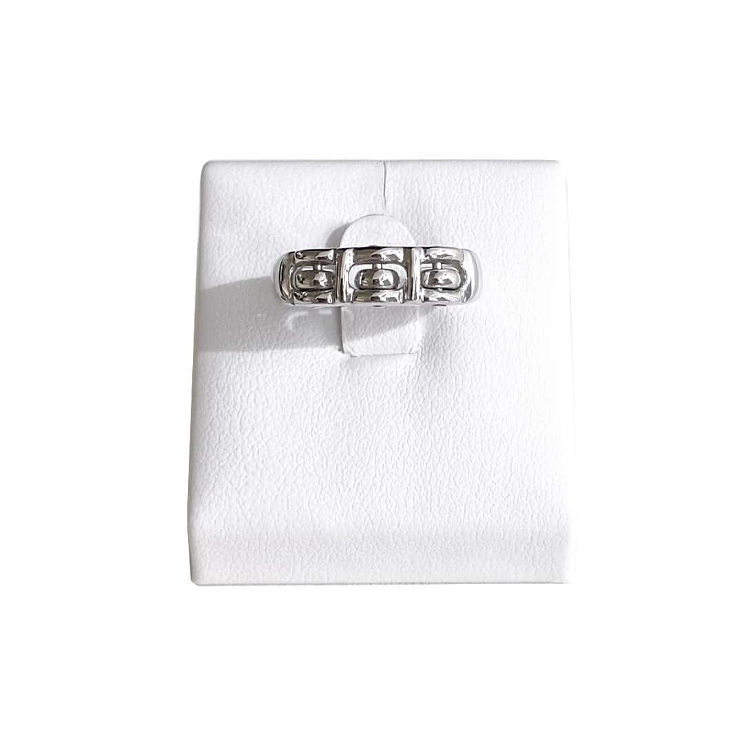 Dieser elegante Ring aus 585 Weißgold besticht durch sein schlichtes Design mit einem raffinierten, verspielten Detail. Oben mittig sind drei kleine Ösen eingearbeitet, die sich sanft bewegen lassen. Auf den ersten Blick wirkt der Ring klassisch und zurückhaltend, doch beim näheren Hinsehen offenbart sich sein besonderer Charme. Ein stilvolles Schmuckstück für alle, die zeitlose Eleganz schätzen – mit einem Hauch Individualität. Ideal für Damen, die das Besondere lieben, ohne auf Zurückhaltung zu verzichten.