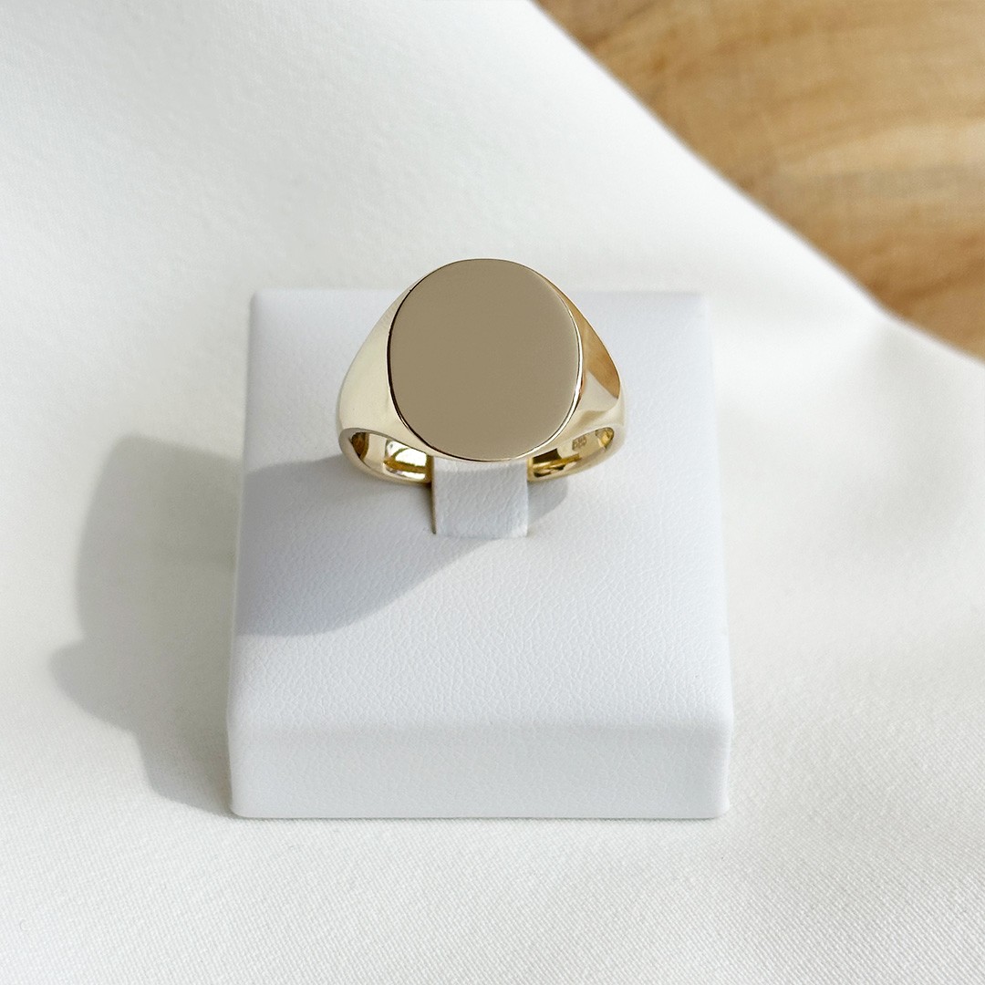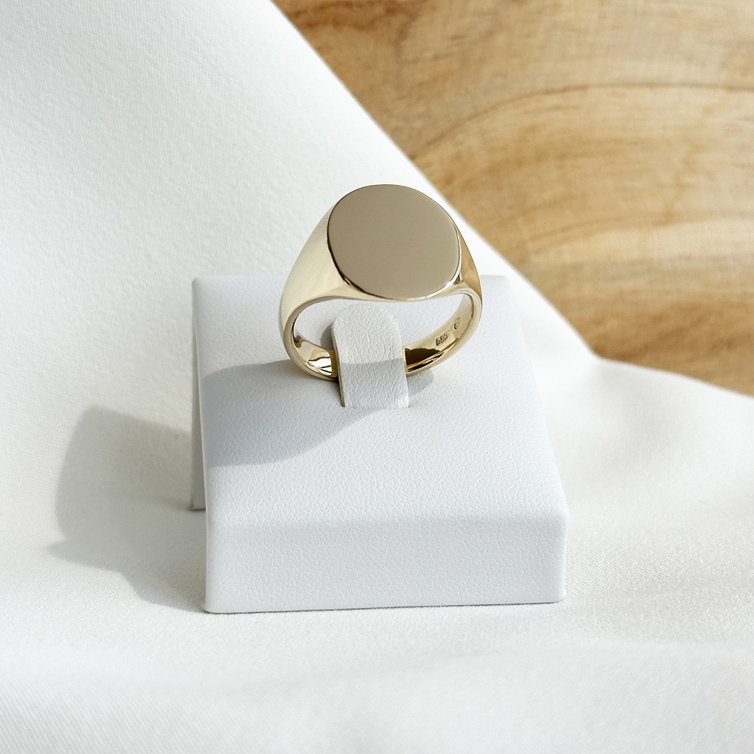 Dieser klassische Gravurring überzeugt durch seine klare Form und eine leicht ovale Fläche, die sich ideal für eine persönliche Gravur eignet. Gefertigt aus 585 Gelbgold und in der Ringgröße 63 erhältlich, wirkt er markant und elegant zugleich – ein Schmuckstück, das besonders häufig von Herren gewählt wird, aber ebenso von Damen getragen werden kann, die einen ausdrucksstarken Ring bevorzugen. Mit einem Durchmesser von 16mm bietet die Oberfläche Platz für individuelle Gravuren – ob Initialen, Symbole oder persönliche Zeichen zu einem besonderen Anlass. Im Geschäft ist ein Muster zur Ansicht vorhanden, und der Ring kann auf Wunsch in jeder Ringweite angefertigt werden.