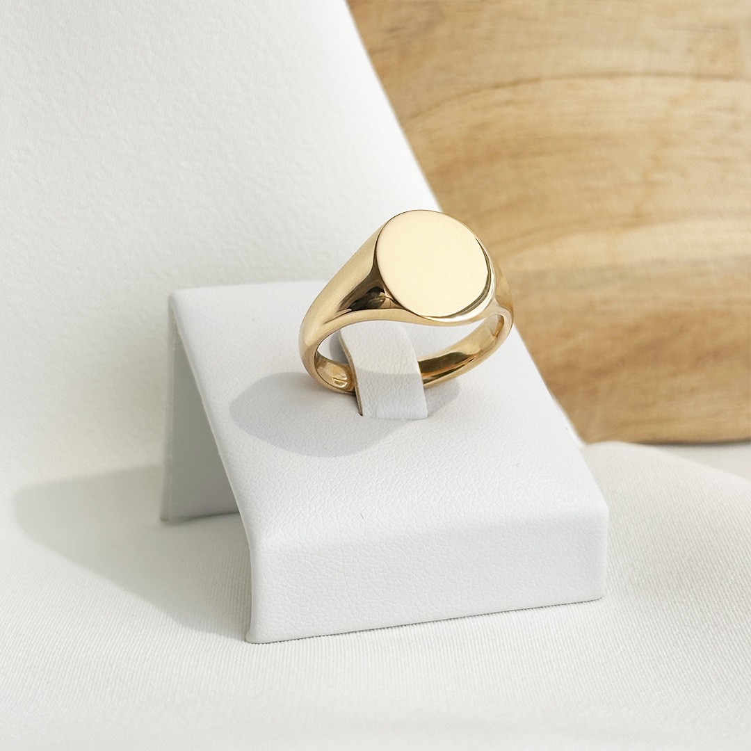 Dieser Gravurring aus 750 Gelbgold besticht durch seine klassische Form und eine fein abgerundete Gravurfläche von 14mm, die sowohl bei Damen als auch bei Herren beliebt ist. Sie bietet Platz für eine individuelle Gestaltung – etwa mit Initialen, einem Symbol oder einem persönlichen Datum. Der Ring ist in der Weite 61 lagernd und kann auf Wunsch in jeder Ringweite angefertigt werden. Ein zeitloses Schmuckstück mit Raum für persönliche Bedeutung, das sich ideal als Geschenk zu besonderen Anlässen eignet.