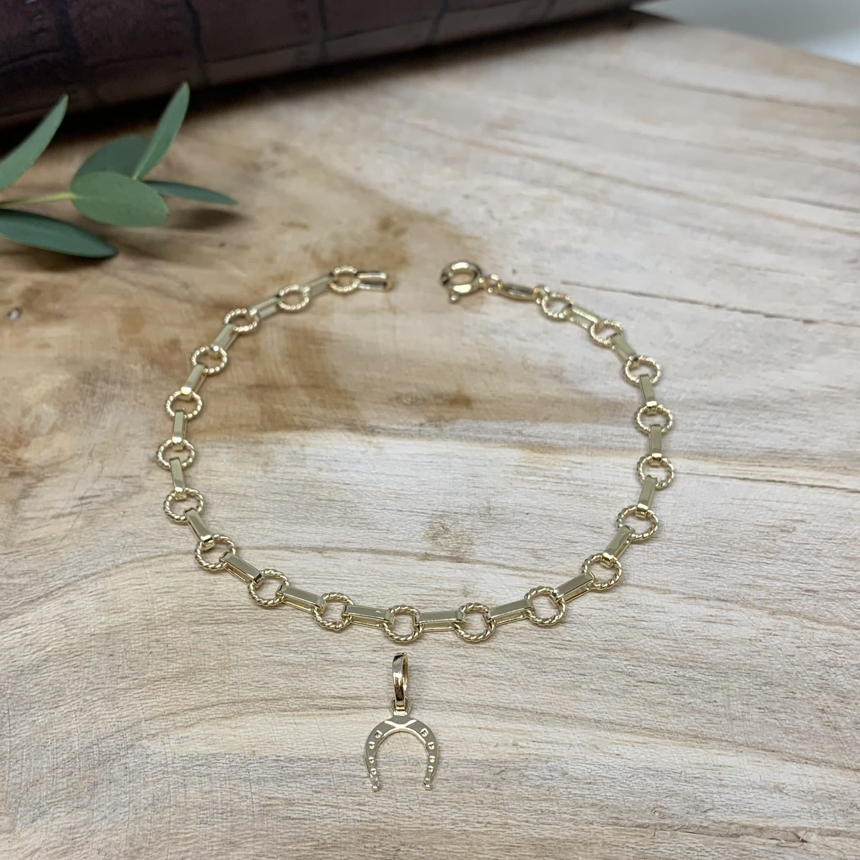 Der kleine Hufeisen-Anhänger aus 585er Gelbgold ist ein stilvoller Glücksbringer, der sich wunderbar als Bettelarmband-Anhänger eignet. Gefertigt aus Gelbgold, strahlt der Anhänger durch seine glänzende Oberfläche eine zeitlose Eleganz aus. Das Hufeisen steht traditionell für Schutz und Glück und ist daher ein beliebtes Symbol, das dem Träger positive Energie verleihen soll. Der kleine Anhänger lässt sich ideal mit anderen Schmuckstücken kombinieren, ohne aufdringlich zu wirken.