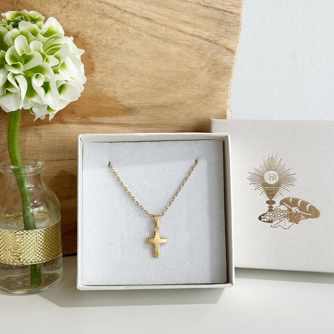 Dieser schlichte Kreuzanhänger aus 585er Gelbgold überzeugt durch seine edle, matte Oberfläche. Der polierte, fein gearbeitete Rand setzt einen dezenten Kontrast und fängt das Licht auf besondere Weise ein, wodurch das Kreuz eine lebendige Ausstrahlung erhält. Mit seiner zurückhaltenden Eleganz ist es ein wunderschönes Schmuckstück für die Taufe, Erstkommunion oder Firmung und wird klassisch an einer Goldkette getragen. Passende Ketten finden Sie in unserem Sortiment. Die Größe des Kreuzes beträgt 12mm.
