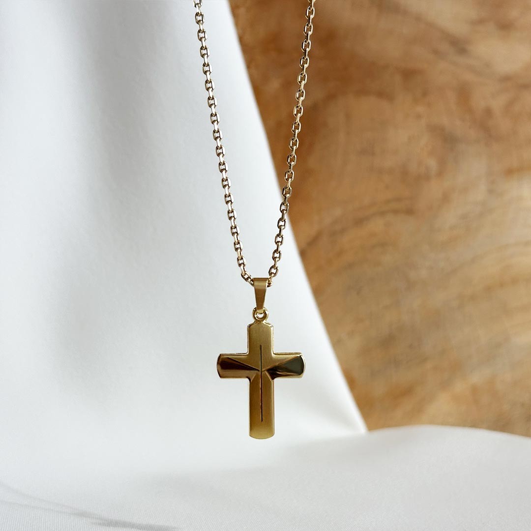 Dieser Kreuzanhänger aus 585 Gelbgold beeindruckt mit einer klaren Formensprache und einem raffinierten Oberflächenspiel. Mit einer Größe von 22 mm zeigt er sich in schlichter, zeitloser Gestaltung, die durch das besondere Design an Ausdruck gewinnt. Der Großteil des Kreuzes ist mattiert, während die äußeren Enden des horizontalen Balkens links und rechts poliert sind – ein feiner Kontrast, der dem Anhänger Tiefe verleiht und das Licht auf lebendige Weise reflektiert. Die angedeutete Flügelstruktur erinnert in ihrer Wirkung fast an Engelsflügel und verleiht dem Schmuckstück eine symbolische Leichtigkeit. Dezent und zugleich ausdrucksvoll – ein Kreuzanhänger mit stiller Besonderheit.