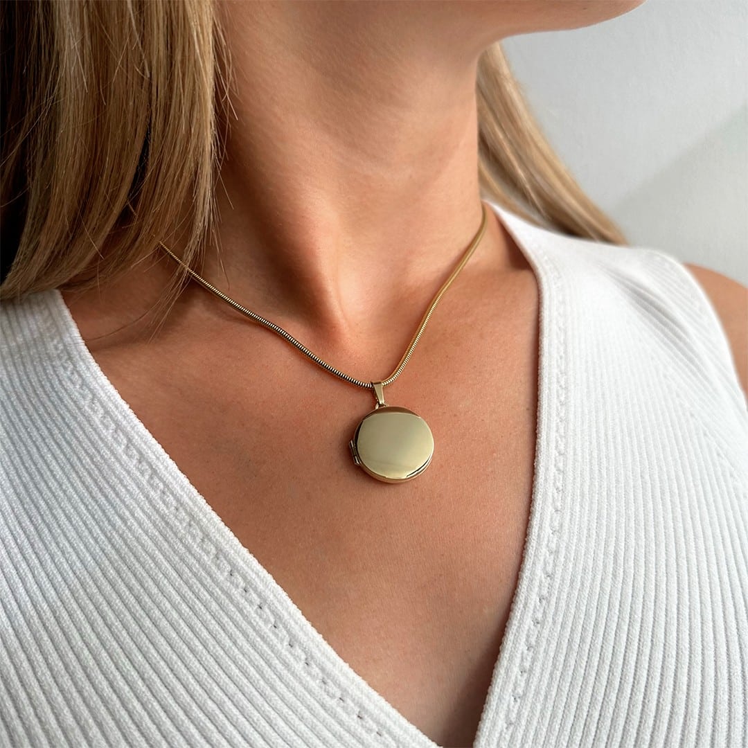 Diese 585 Gelbgold Medaillon ist ein wunderbares Geschenk für besondere Anlässe und Momente, die im Herzen verankert bleiben sollen. Mit seiner hochglanz polierten Oberfläche strahlt es eine zeitlose Schönheit aus. Das Medaillon lässt sich seitlich öffnen und bietet somit die Möglichkeit, Erinnerungsfotos an magische Momente oder geliebte Menschen darin aufzubewahren. Für eine persönliche Note übernehmen wir gerne kostenlos das Einsetzen Ihres Lieblingsfotos. Dieses runde Medaillon ist ein kostbares Schmuckstück, das die Erinnerungen und Emotionen in sich trägt und bei jedem Blick darauf eine ganz besondere Bedeutung entfaltet. Der Durchmesser des Medaillon Anhängers beträgt 21,5mm. Passende Goldketten in unterschiedlichen Längen und Stärken finden Sie ebenfalls in unserem Sortiment.