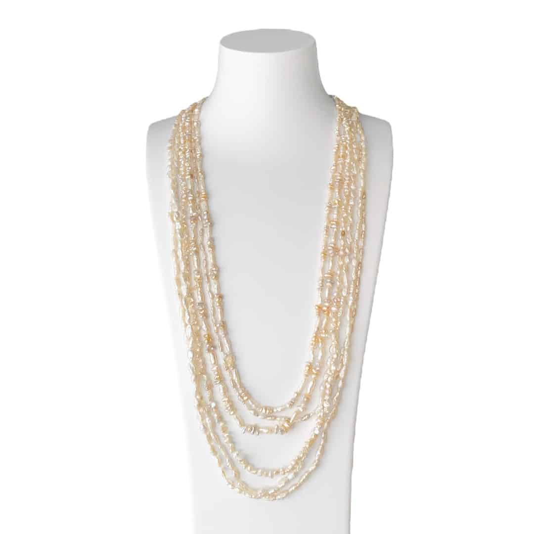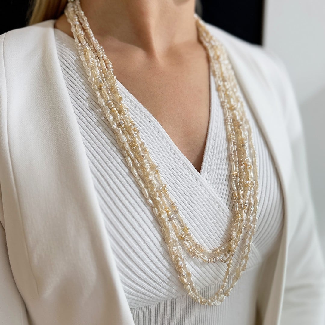 Diese mehrreihige Perlenkette beeindruckt mit ihrer Eleganz und Vielseitigkeit. Mit einer großzügigen Länge von 75cm und einer mehrreihigen Anordnung bezaubernder Süßwasser-Kulturperlen zieht sie bewundernde Blicke auf sich. Ihre besondere Anziehungskraft liegt in der Vielfalt der Perlenformen. Die Perlenkette wird durch eine 925 Silber Magnetschließe sicher zusammengehalten, die nicht nur für Stabilität sorgt, sondern auch ein müheloses Öffnen und Schließen ermöglicht. Dieses Schmuckstück ist vielseitig und kann modisch im Alltag oder elegant zu einer Bluse kombiniert werden. Die zeitlose Eleganz und die erstklassige Handwerkskunst machen diese Perlenkette zu einem Must-Have für jede Schmuckkollektion.