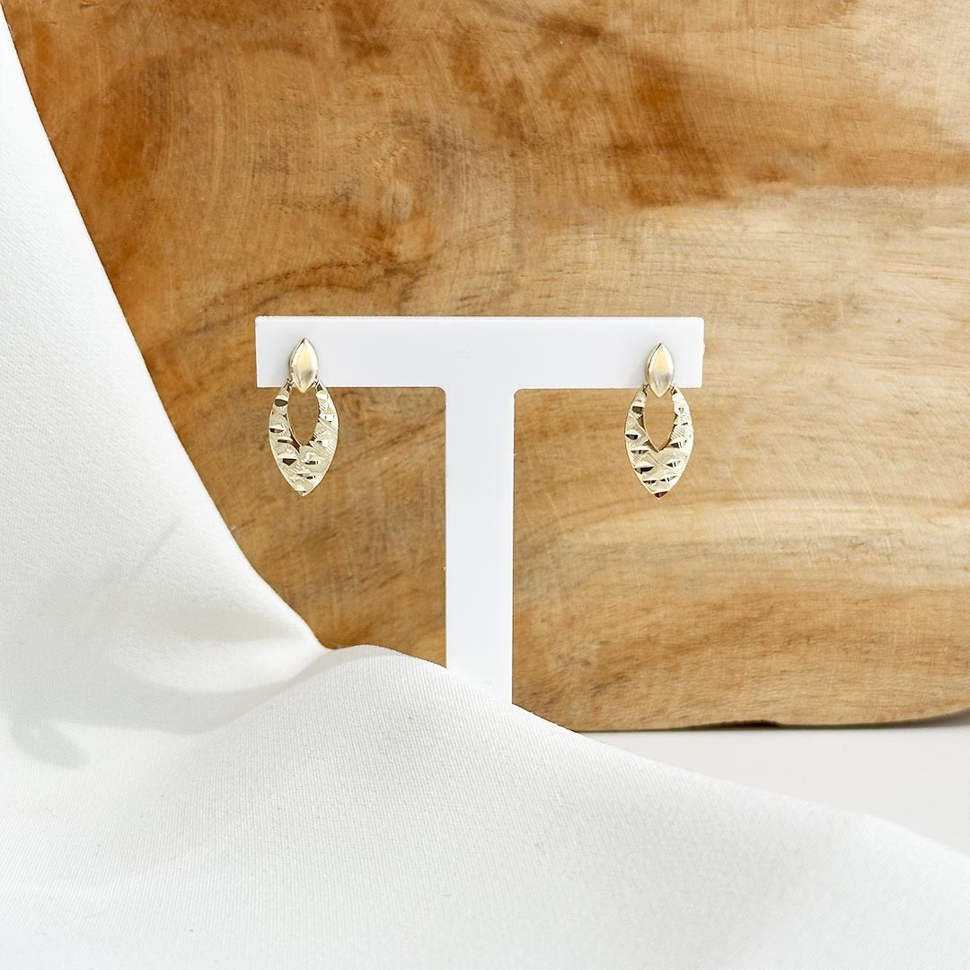 Diese Ohrstecker aus 585er Gelbgold zeigen sich in einer sanften Navette-Form mit durchbrochener Mitte – ein detailreiches Design, das Leichtigkeit und Eleganz vereint. Die stark strukturierte Oberfläche fängt das Licht auf besondere Weise ein und erzeugt ein feines Glitzern bei jeder Bewegung, ohne dabei aufdringlich zu wirken. Mit einer Größe von 17mm setzen die Stecker einen stilvollen Akzent und bleiben dennoch dezent. Ein außergewöhnlicher Ohrschmuck mit ruhiger Präsenz und einem Hauch Raffinesse.