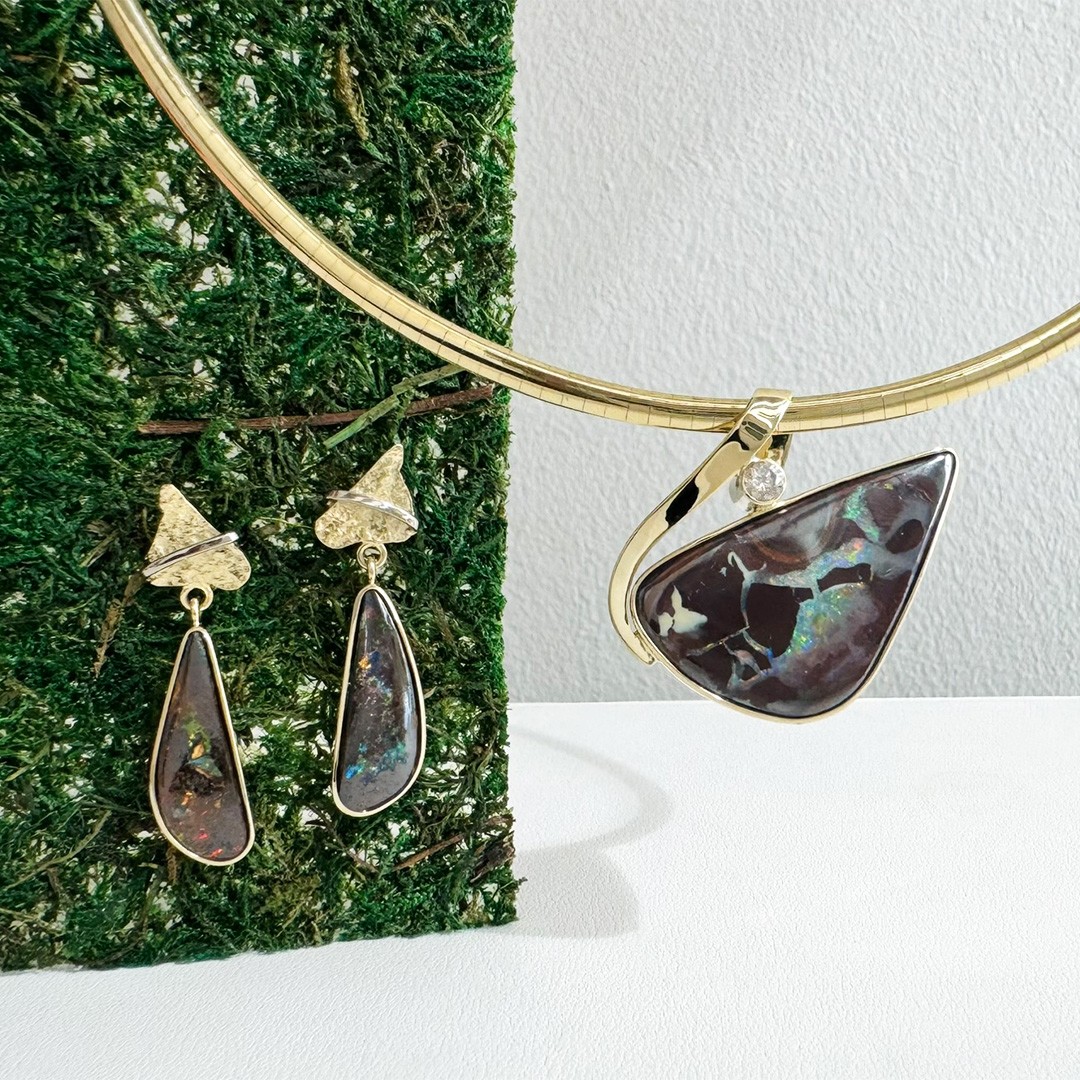 Dieser handgefertigte Anhänger aus 585er Gelbgold zeigt einen Matrix Boulder Opal, der mit seinem lebendigen Farbspiel und der natürlichen Struktur im Mittelpunkt steht. Die schlichte Fassung aus Gold lässt den Opal besonders gut zur Geltung kommen und betont seine einzigartigen Muster. Eine zarte Schlaufe dient als Verbindung zur Kette oder einem Halsreif und verleiht dem Design eine leichte, verspielte Note. Ein kleiner Brillant ergänzt das Schmuckstück mit einem dezenten Funkeln und schafft einen schönen Kontrast zum farbenreichen Opal. Ein besonderer Anhänger für alle, die das Außergewöhnliche suchen.