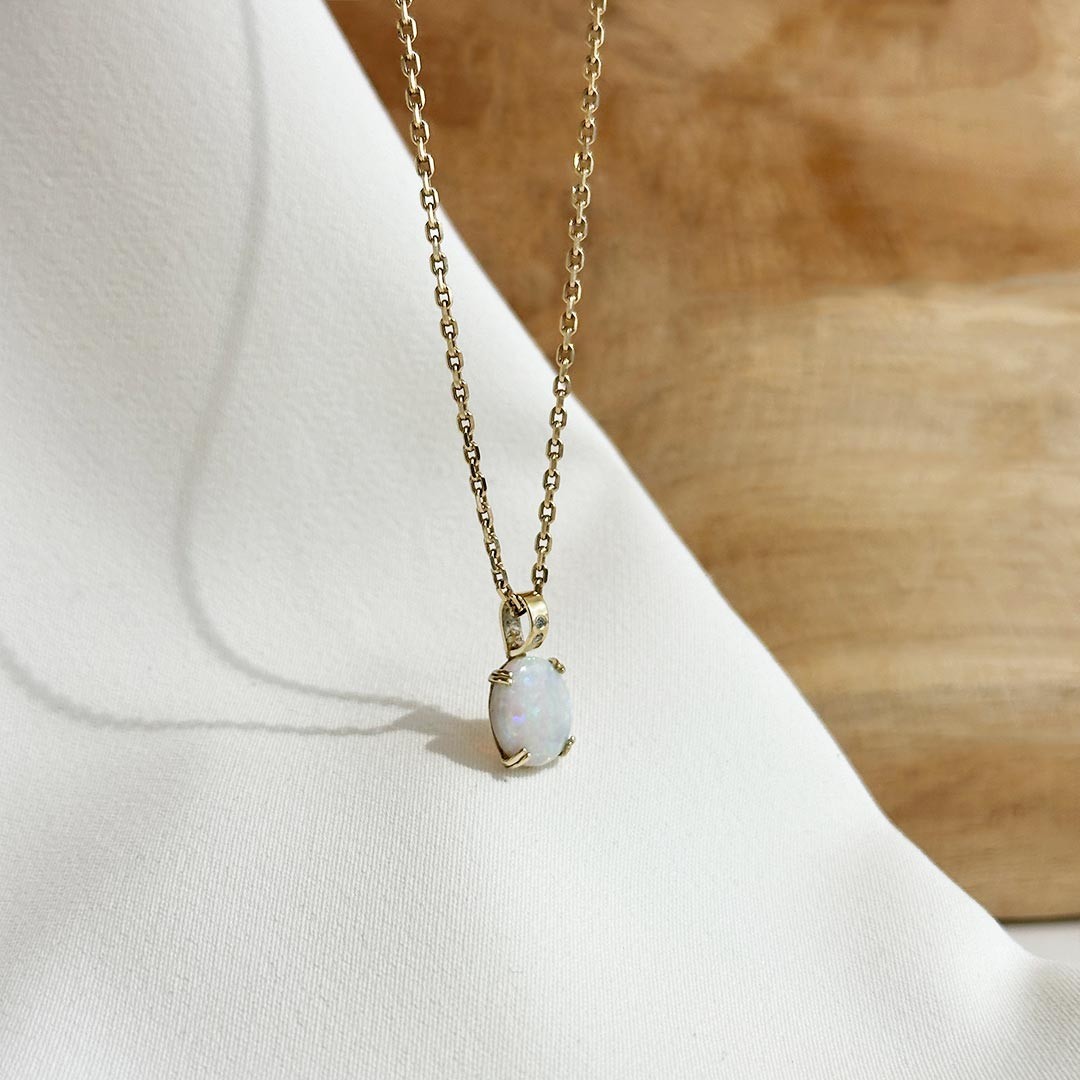 Dieser handgefertigte Anhänger aus 585 Gelbgold fasst einen ovalen Opal in zarten Krappen, die viel Licht an den Stein lassen und so sein charakteristisches Farbspiel – das sogenannte Opalisieren – besonders schön zur Geltung bringen. Mit seiner Größe von 10mm bleibt der Anhänger dezent, zieht aber durch das lebendige Schimmern sofort die Blicke auf sich. Zwei kleine, fein eingefasste Diamanten oberhalb des Steins sorgen für ein zusätzliches Funkeln und verleihen dem Schmuckstück eine elegante Note. Getragen an einer schlichten Karreekette entfaltet der Opalanhänger seine volle Wirkung. Ein feines Geschenk – besonders für Geburtstagskinder im Oktober, denn der Opal gilt als Geburtsstein dieses Monats.