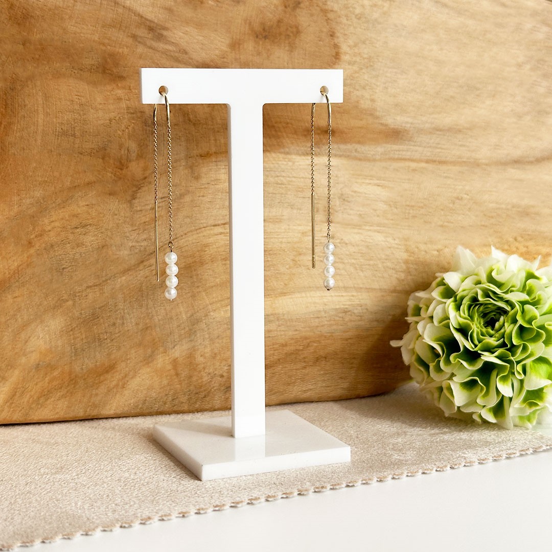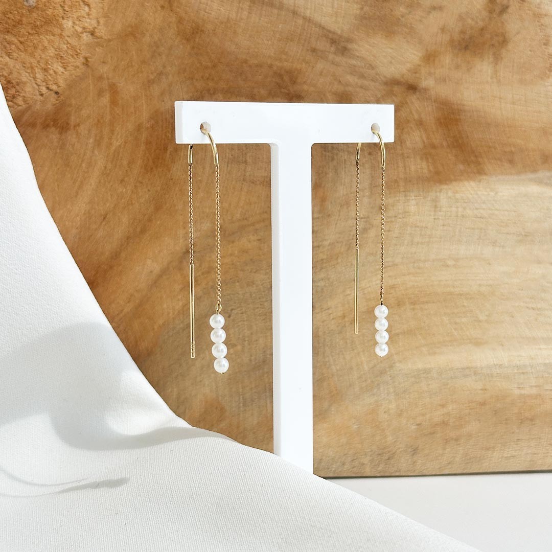 Dieser elegante 585 Gelbgold Ohrschmuck mit Akoya-Perlen wurde mit Liebe zum Detail von unserem Goldschmied handgefertigt. Die feine Goldkette wird durch einen zarten Bügel geführt, sodass die Ohrringe leicht durch das Ohr gezogen werden können. Als Highlight reihen sich vorne vier schimmernde Akoya-Perlen untereinander und verleihen dem Schmuckstück eine edle Leichtigkeit. Die Kombination aus filigranem Design und klassischer Perle macht diesen Durchzieher zum perfekten Begleiter für besondere Anlässe wie Hochzeiten, aber auch für den Alltag.