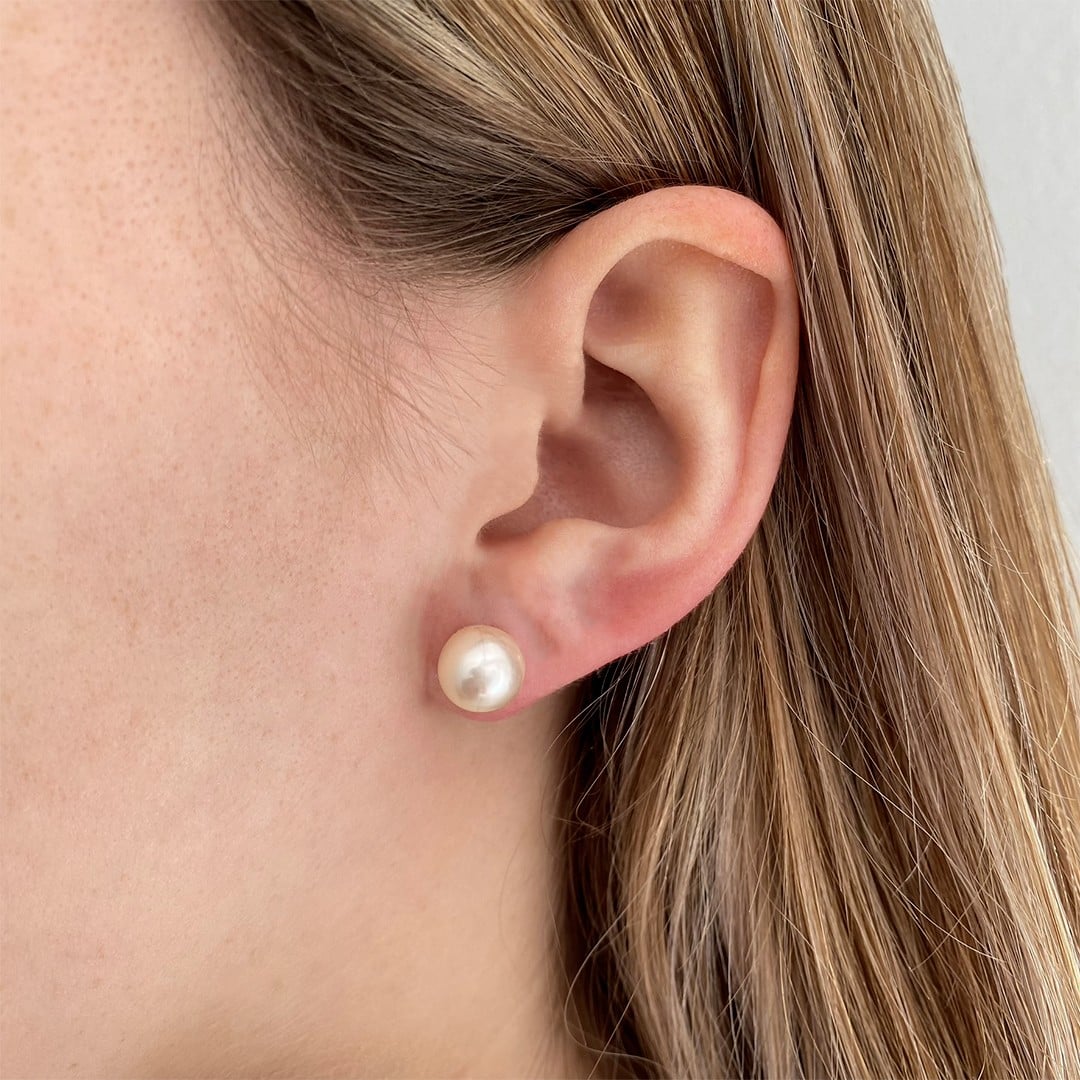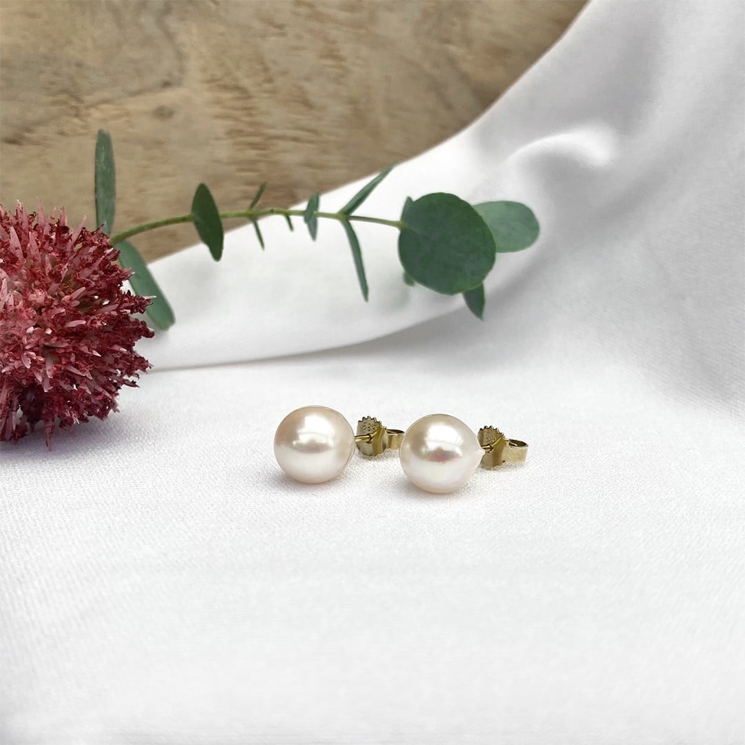 Diese Akoya-Perlenohrstecker mit einer Größe von 9mm sind auf 585er Gelbgold-Patenten gefasst und zeichnen sich durch ihren ausdrucksstarken, natürlichen Charakter aus. Die Perlen zeigen an der Unterseite eine sichtbar unregelmäßige Oberfläche – eine Eigenschaft, die sie als gewachsene Unikate kennzeichnet und ihren individuellen Charme ausmacht. Beim Tragen tritt diese Besonderheit nicht in Erscheinung, da sie nur bei genauer Betrachtung von der Seite oder von unten sichtbar wird. Gerade diese natürliche Struktur macht die Ohrstecker zu einer charmanten Wahl für alle, die charaktervollen Perlenschmuck mit Persönlichkeit bevorzugen – präsent, lebendig und mit authentischer Ausstrahlung.