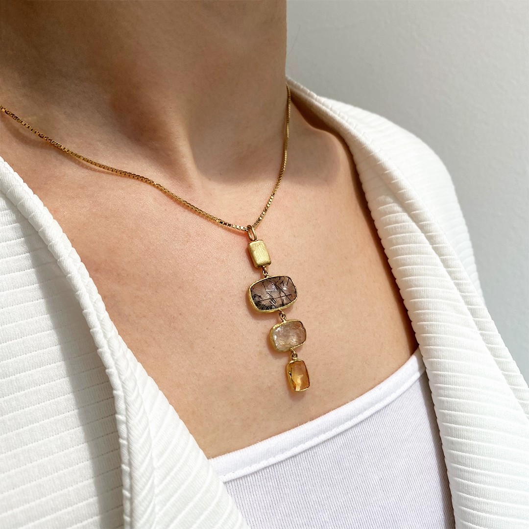 Dieser Schmuckanhänger aus 585er Gelbgold ist mit einem Rutilquarz und einem Citrin besetzt – zwei Edelsteine, die durch ihre helle, transparente Ausstrahlung und die feine Fassung besonders schön zur Geltung kommen. Die warmen Töne der Steine harmonieren mit dem Gold und verleihen dem Anhänger eine elegante, zugleich natürliche Wirkung. Ein stilvolles Schmuckstück mit ruhiger Ausstrahlung und feiner Leuchtkraft. Passende Goldketten finden Sie selbstverständlich ebenfalls in unserem Sortiment.