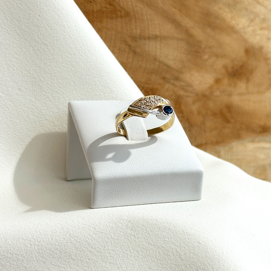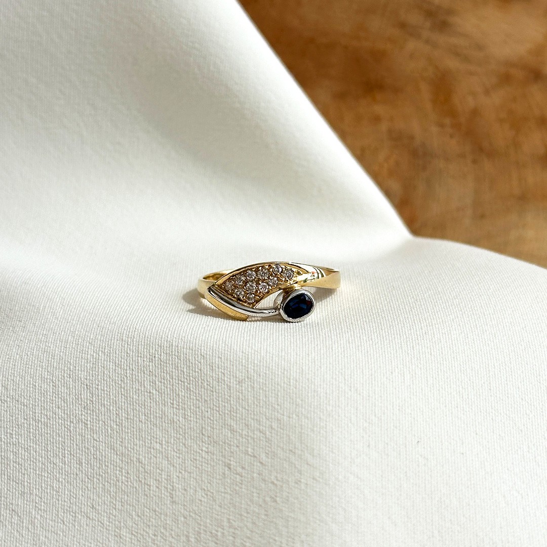 Dieser elegante Ring aus 585er Gelb- und Weißgold vereint klassische Elemente mit einer modernen Gestaltung. Die leicht geschwungene Form der Ringschiene verleiht ihm eine sanfte Dynamik, die durch das zweifarbige Design besonders schön betont wird. In der Fläche aus Gelbgold sind elf funkelnde Brillanten eingefasst, die wie ein Meer aus Licht erstrahlen und dem Schmuckstück eine glanzvolle Wirkung verleihen. Als feiner Kontrast zieht sich eine Linie aus Weißgold über das Design, in der ein ovaler Saphir sorgfältig gefasst ist. Sein tiefes Blau entfaltet durch die helle Umrahmung eine besondere Strahlkraft und bringt zusätzliche Lebendigkeit in das harmonische Gesamtbild. Der Ring wirkt edel und zeitlos, zugleich aber auch modern und vielseitig kombinierbar. Dank seiner zweifarbigen Gestaltung lässt er sich sowohl zu Schmuckstücken in Gelbgold als auch in Weißgold stilvoll tragen – ein Schmuckstück, das durch Eleganz und Ausdrucksstärke begeistert.