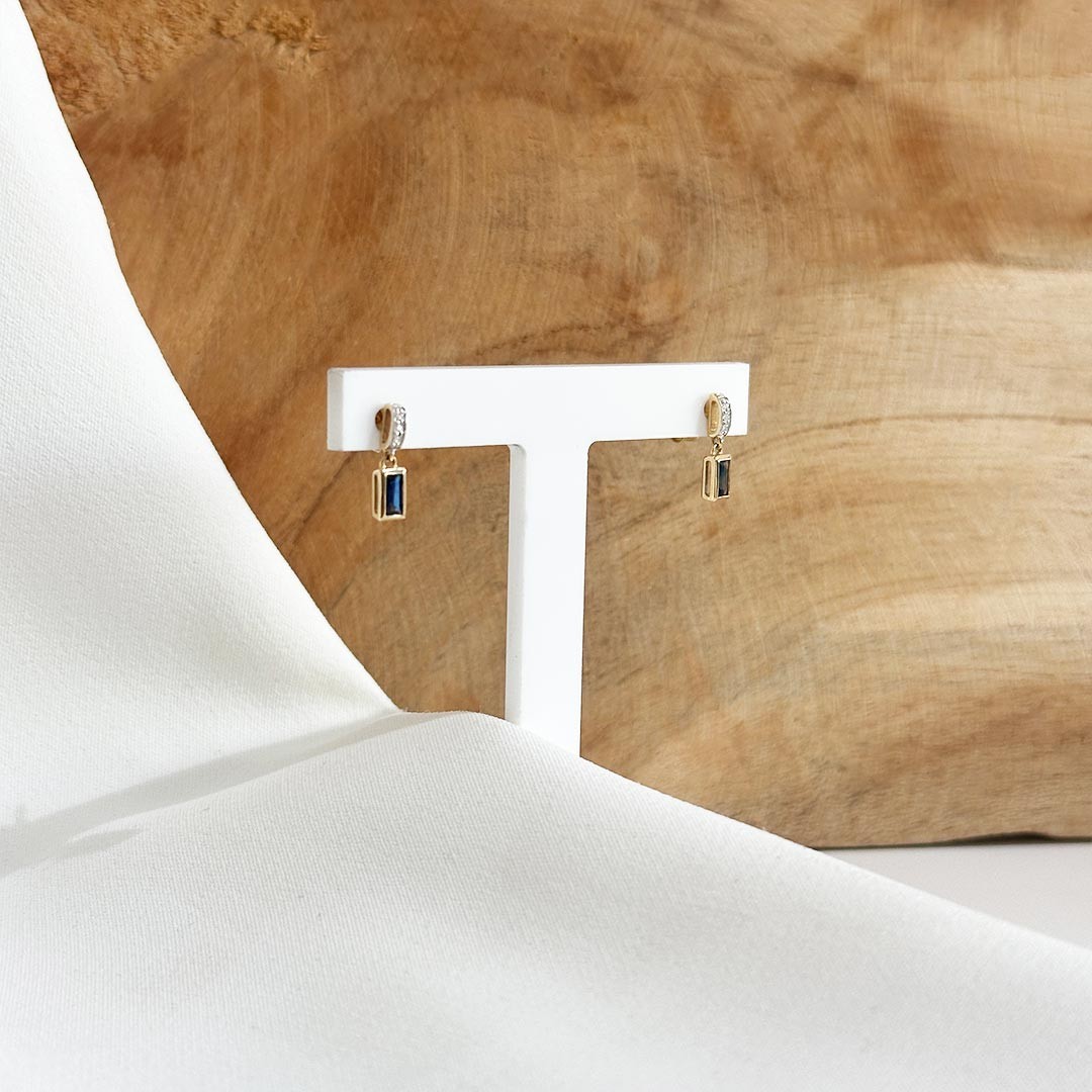 Genießen Sie feine Eleganz mit diesen zarten 585er Goldohrringen, besetzt mit einem blauen Saphir und strahlenden Diamanten. Die Unaufdringlichkeit und Feinheit dieser Ohrringe machen sie zu zeitlosen Begleitern. Der blaue Saphir in der warmen Goldfarbe schafft einen faszinierenden Kontrast zu den leuchtenden Diamanten und verleiht diesem Schmuckstück eine einzigartige Ausstrahlung. Ein Accessoire, das durch seine raffinierte Kombination von Farben und Edelsteinen bezaubert.