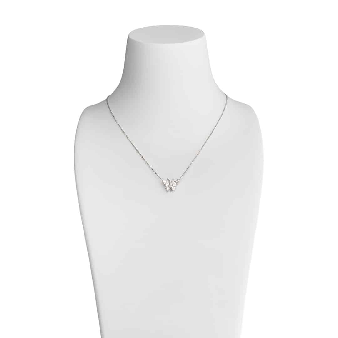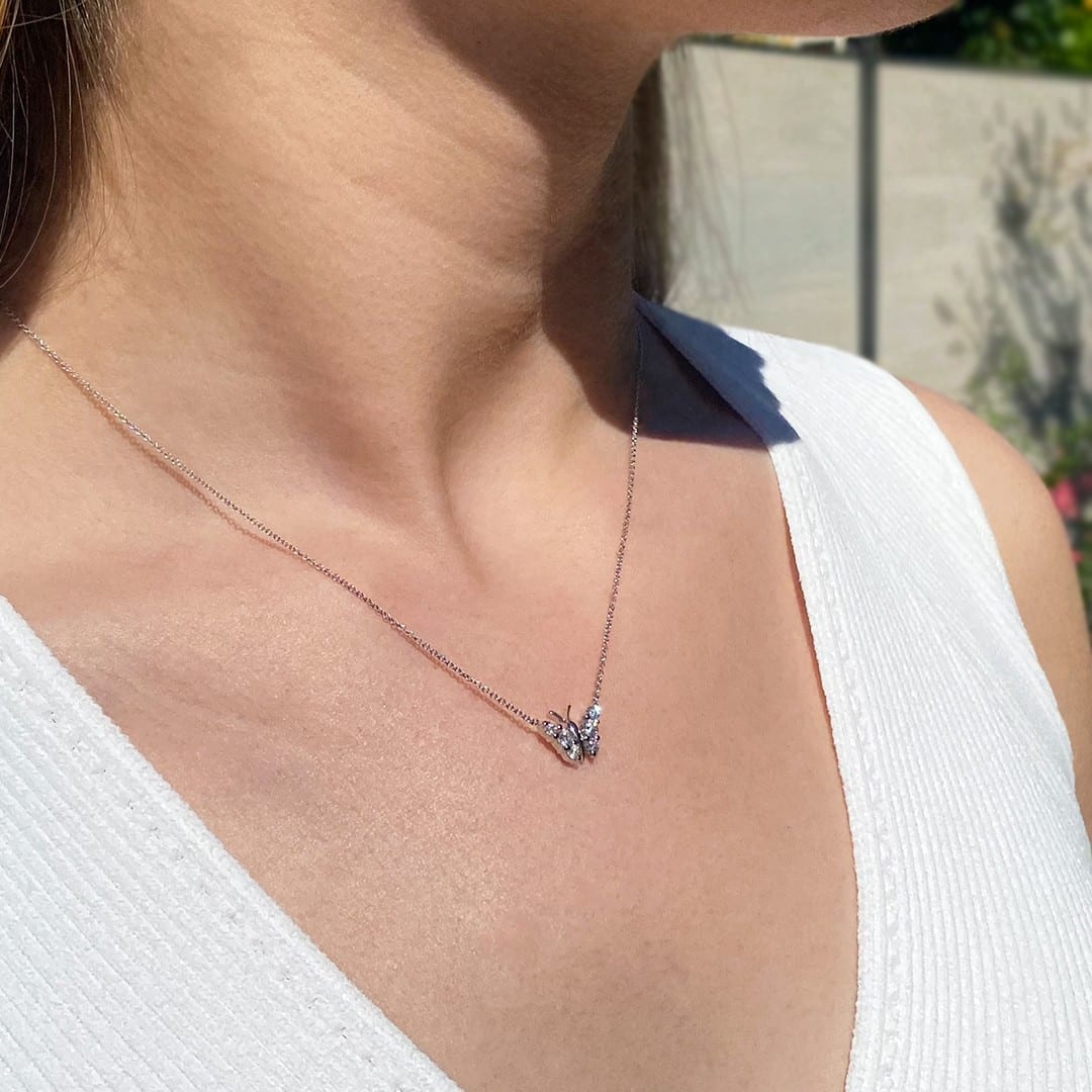 Tauchen Sie ein in die zarte Eleganz unseres Schmetterling-Colliers aus hochwertigem 750 Weißgold. Der feine Anhänger in Schmetterlingsform ist mit funkelnden Brillanten besetzt, die dem Collier einen Hauch von Magie und Leichtigkeit verleihen. Mit einer Länge von 42cm liegt die Kette elegant und halsnah an, sodass der Anhänger wunderschön zur Geltung kommt – dezent, aber wirkungsvoll. Dieses Schmuckstück lässt sich wunderbar mit klassischen Brillantohrsteckern kombinieren und eignet sich sowohl für besondere Anlässe als auch als liebevolles Geschenk an sich selbst. Ein bezauberndes Collier, das mit seinem feinen Funkeln begeistert und Freude schenkt.