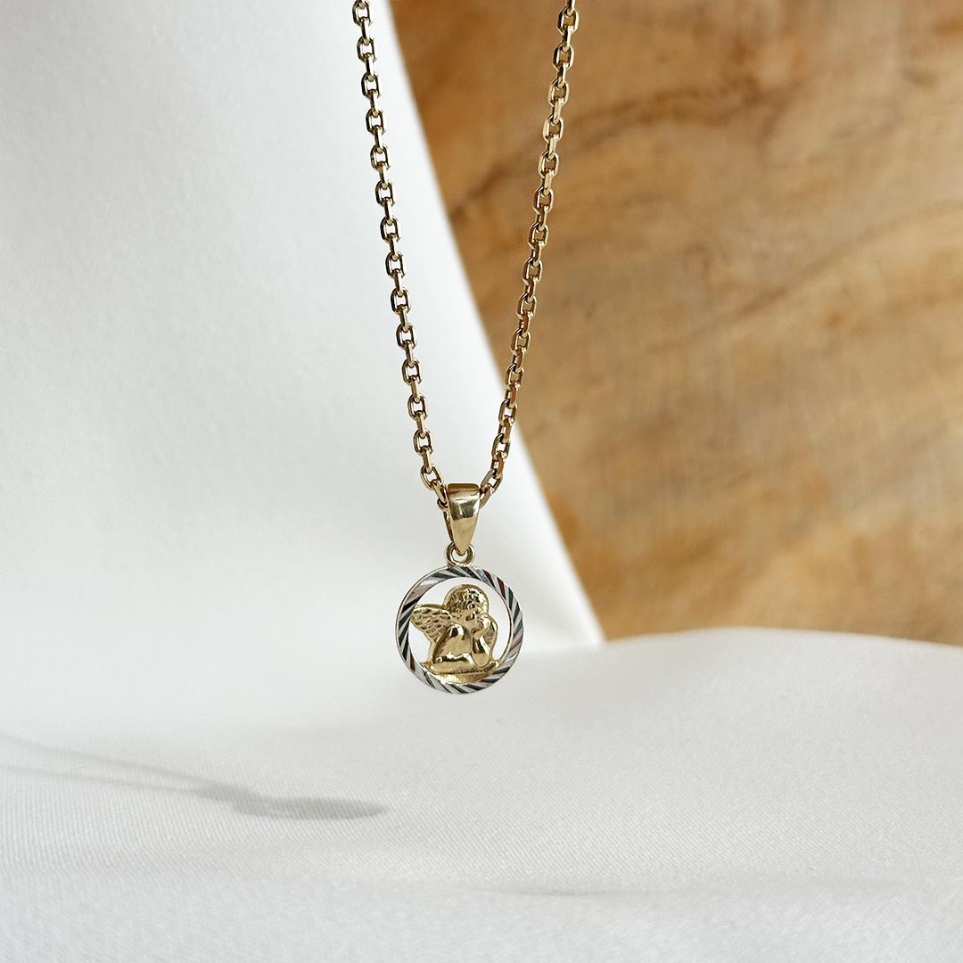 Dieser Schutzengel-Anhänger aus 585er Gelb- und Weißgold ist ein liebevoll gestaltetes Schmuckstück mit besonderer Wirkung. Mit einer Größe von 10mm zeigt er in der Mitte einen klassischen, goldfarbenen Engel, der durch den ausgeschnittenen Hintergrund scheinbar schwerelos im Rahmen schwebt. Die Umrandung aus Weißgold ist fein strukturiert und erinnert mit ihrem strahlenförmigen Muster an Sonnenlicht – je nach Lichteinfall entstehen zarte Reflexe, die dem Anhänger eine lebendige Ausstrahlung verleihen. Ein Symbol für Schutz und Geborgenheit, das nicht nur durch seine Bedeutung, sondern auch durch seine filigrane Gestaltung berührt. Hinweis: Hier ist keine Gravur möglich.