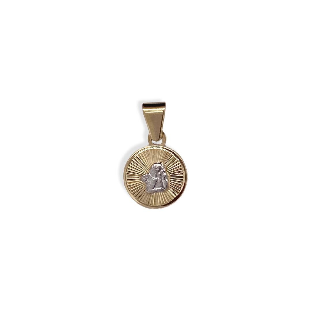 Dieser liebevoll gestaltete Schutzengel-Anhänger aus 585er Gelb- und Weißgold vereint symbolische Kraft mit zarter Eleganz. In der Mitte des runden Anhängers – mit einer Größe von 8mm – sitzt ein kleiner Engel aus Weißgold, umgeben von strahlenförmigen Linien, die an Sonnenstrahlen erinnern. Es wirkt, als würde der Engel geborgen im Licht sitzen – ein Bild voller Wärme und Geborgenheit. Ein wundervolles Geschenk zur Geburt oder Taufe, das den Wunsch nach Schutz und Glück auf besonders schöne Weise ausdrückt. Für Babys und Kleinkinder empfehlen wir eine Kettenlänge von 36cm. Passende Goldketten finden Sie ebenfalls in unserem Sortiment.