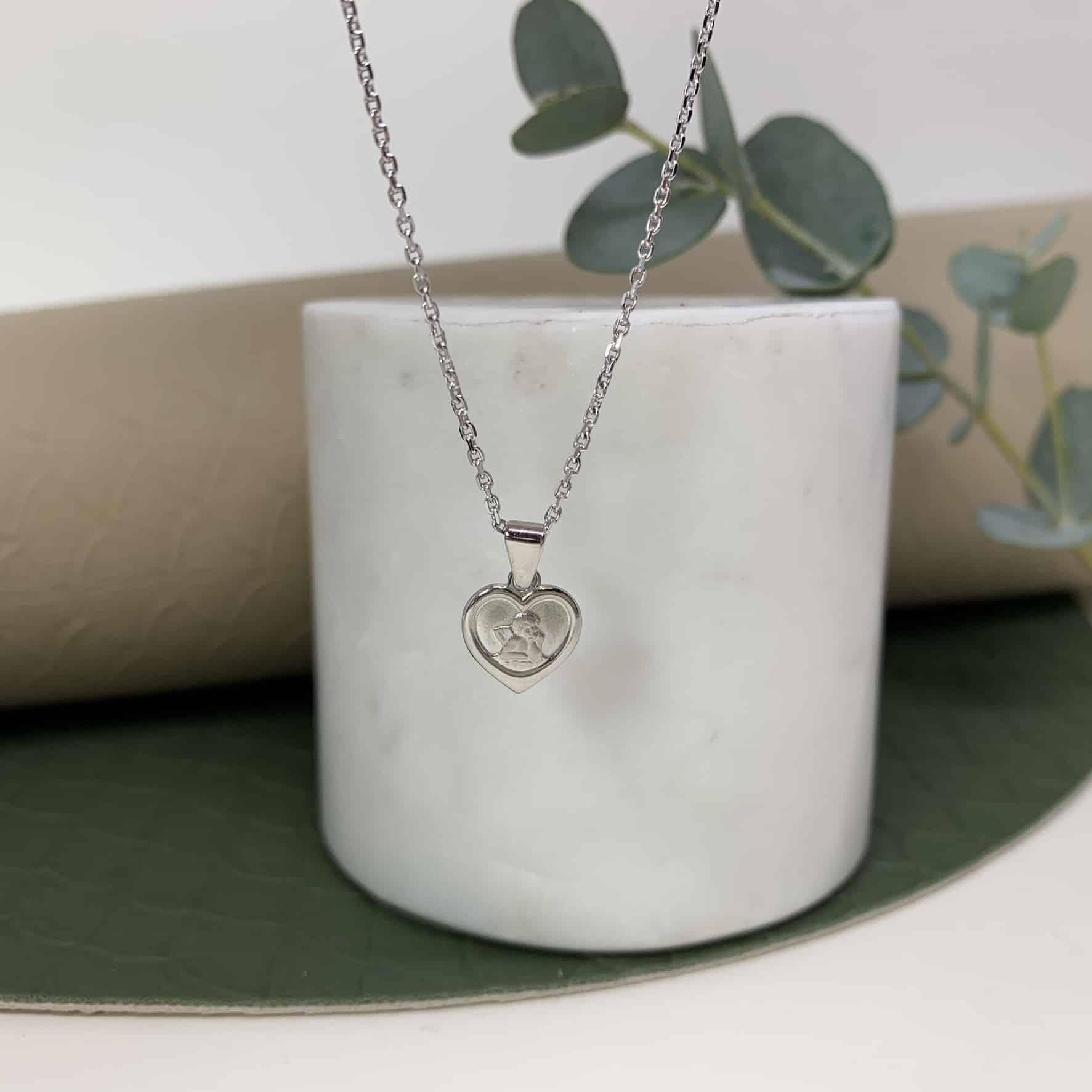 Dieser kleine Schutzengel-Anhänger aus 585er Weißgold in Herzform misst 8mm und besticht durch seine weiche, runde Form. Der polierte Rand verleiht dem Anhänger einen eleganten Glanz und hebt den Engel im Inneren besonders hervor. Mit seiner zarten und schmeichelnden Erscheinung ist dieser Anhänger ein wunderbares, symbolträchtiges Geschenk für Taufe, Geburt oder Erstkommunion. Die feine Gestaltung macht ihn zu einem zeitlosen Schmuckstück, das für Schutz, Geborgenheit und Liebe steht. Ideal für Kinder oder als zartes Schmuckstück für Erwachsene. Passende Weißgoldketten in verschiedenen Längen finden Sie ebenfalls in unserem Sortiment.