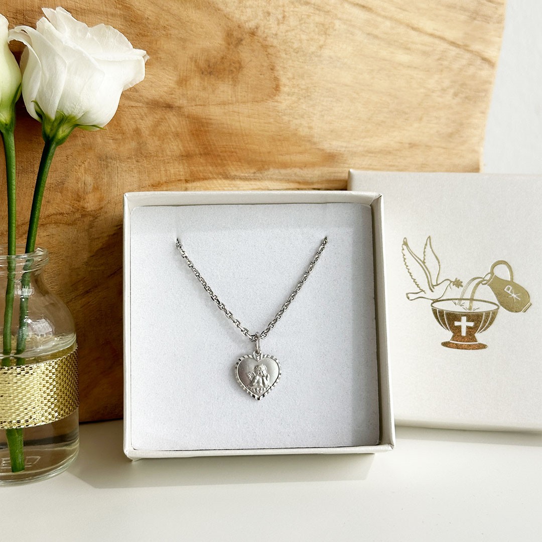 Dieser Schutzengel-Anhänger aus 585er Weißgold ist in einer wunderschönen Herzform gefertigt und misst 12mm. Der Anhänger besticht durch den facettierten Rand, der das Licht auf wunderschöne Weise bricht und für einen dezenten Schimmer sorgt. Die matte Fläche im Inneren des Herzens bildet einen harmonischen Kontrast zum polierten Rand und hebt den Engel in der Mitte besonders hervor. Herzformen sind besonders bei Mädchen beliebt, aber auch als Geschenk für besondere Anlässe wie Taufe oder Erstkommunion ist dieser Anhänger eine wunderbare Wahl. Der Anhänger symbolisiert Schutz und Geborgenheit. Auf der Rückseite bietet der Anhänger Platz für eine kurze persönliche Gravur. Passende Weißgoldketten finden Sie ebenfalls in unserem Sortiment.