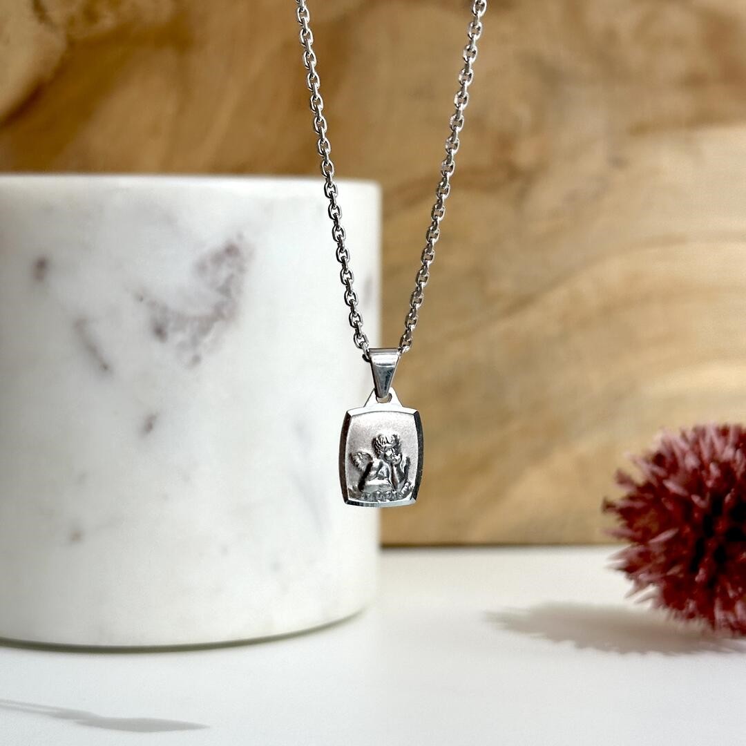 Dieser Schutzengel-Anhänger aus 585er Weißgold ist in einer rechteckigen, leicht gewölbten Form gefertigt, die durch die sanfte Krümmung eine weiche, schmeichelnde Ausstrahlung erhält. Der polierte Rand bildet einen harmonischen Kontrast zum mattierten Inneren, wodurch der Engel im Zentrum besonders betont wird. Trotz seiner eckigen Form wirkt der Anhänger durch die gewölbte Gestaltung sehr weich und nicht zu kantig – ideal für Mädchen und Buben. Mit einer Größe von 10mm ist dieser Anhänger ein zeitloses Schmuckstück, das für Geborgenheit und Schutz steht. Er eignet sich perfekt als Geschenk für besondere Anlässe. Passende Weißgoldketten finden Sie ebenfalls in unserem Sortiment.