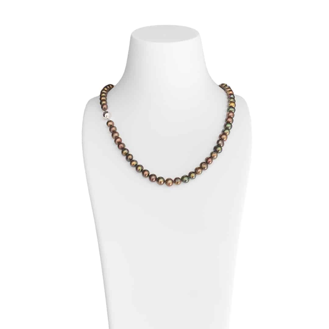 Unsere Süßwasserperlenkette in Braun mit einer Perlengröße von 6-7,5mm ist ein außergewöhnlicher Hingucker. Mit einer Länge von 42cm und einer polierten 585 Weißgold Kugelschließe strahlt sie schlichte Eleganz aus. Die interessante Farbe der Perlen verleiht der Kette eine besondere Note und ermöglicht vielfältige Kombinationsmöglichkeiten im Layering-Style mit anderen Ketten. Ob als einzelnes Statement oder in Kombination, diese Perlenkette ist vielseitig und passt zu verschiedensten Outfits und Anlässen. Lassen Sie sich von ihrer Einzigartigkeit bezaubern und setzen Sie mit diesem Schmuckstück stilvolle Akzente.