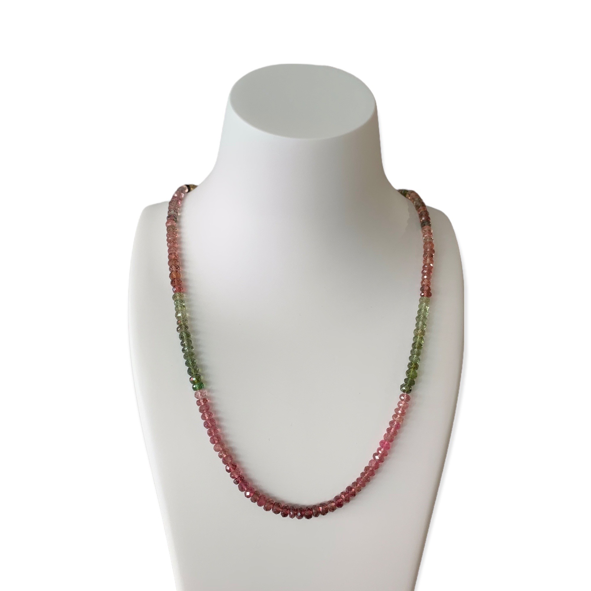 Diese Turmalin Kette besticht durch ihren einzigartigen Farbverlauf, der die ganze Vielfalt dieses faszinierenden Edelsteins zeigt. Die sorgfältige Sortierung der Farben macht sie zu einem besonderen Blickfang und verleiht ihr eine harmonische, edle Ausstrahlung. Mit einer Länge von 55 cm bietet die Kette vielseitige Tragemöglichkeiten, während der klassische Karabiner aus 585 Weißgold für sicheren Halt sorgt. Ein elegantes und farbenfrohes Schmuckstück für alle, die die strahlenden Nuancen des Turmalins lieben und ein stilvolles Accessoire für den Alltag und besondere Anlässe suchen.