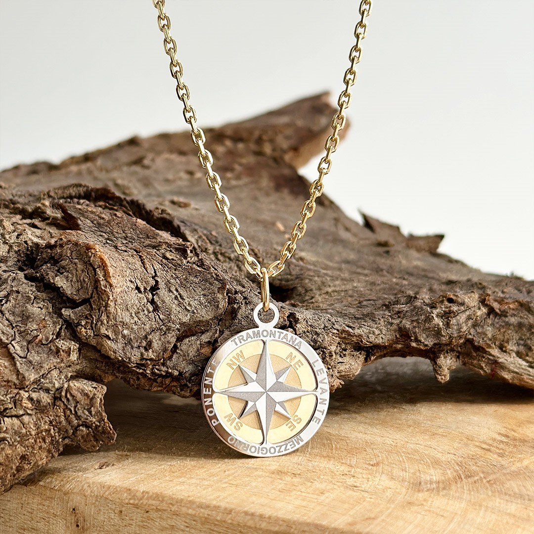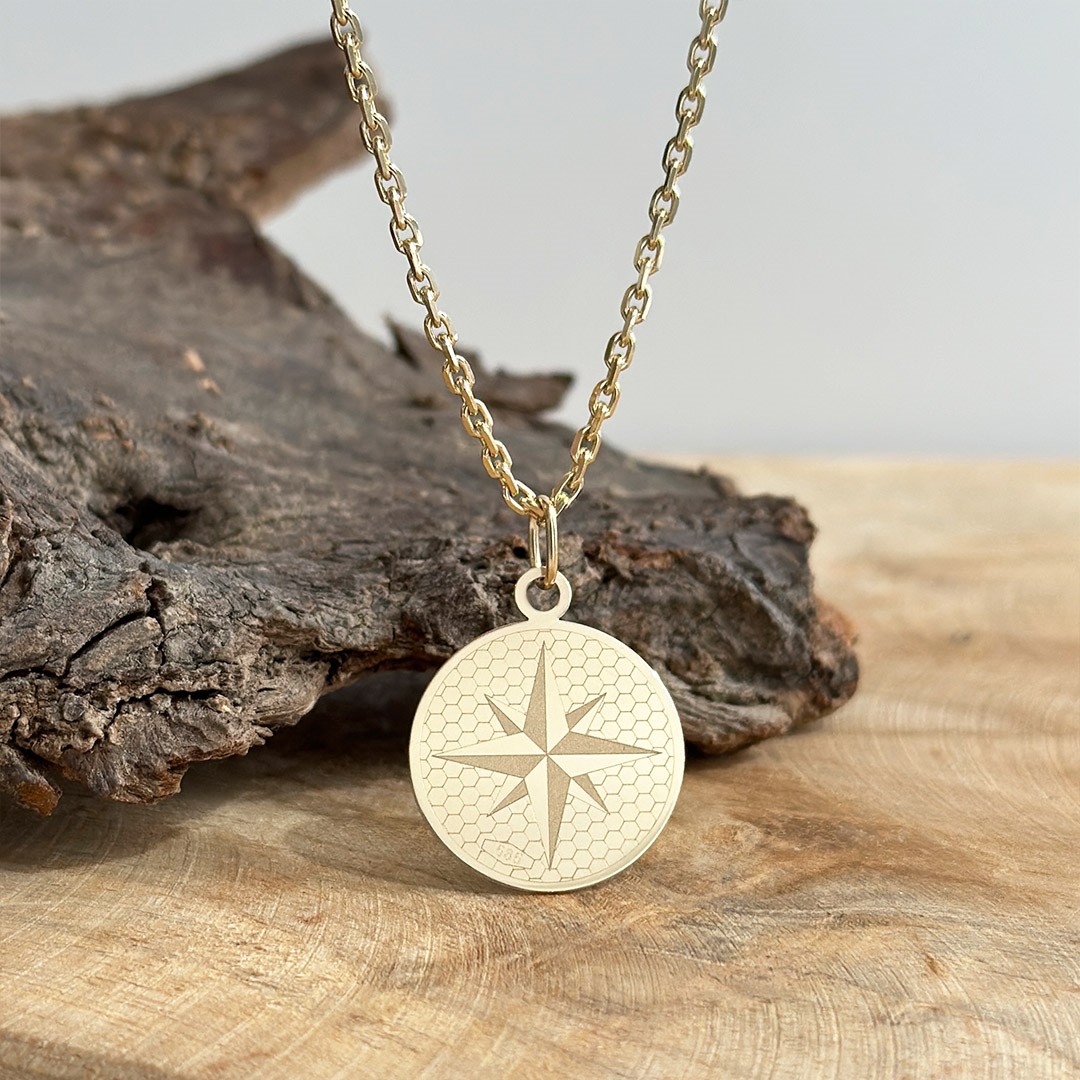 Unser Windrose-Anhänger aus 585 Gelb- und Weißgold verbindet klassische Handwerkskunst mit symbolischer Tiefe. Mit einem Durchmesser von 20 mm steht die Windrose für Orientierung, Zielstrebigkeit und innere Stärke – ein ausdrucksstarkes Motiv für alle, die ihren eigenen Weg gehen. Die zweifarbige Gestaltung sorgt für einen feinen Kontrast und unterstreicht die sorgfältige Verarbeitung. Dieser Anhänger eignet sich ideal als Geschenk zu besonderen Anlässen wie Geburtstagen, Jubiläen oder zum Vatertag. Passende Goldketten in verschiedenen Längen und Stärken finden Sie selbstverständlich ebenfalls in unserem Sortiment.