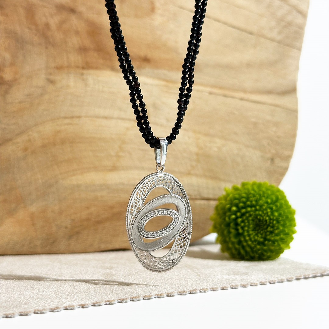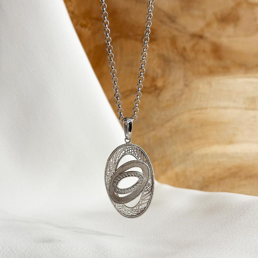 Entdecken Sie diesen bezaubernden ovalen Weißgoldanhänger, der mit funkelnden, farblosen Zirkonia-Steinen besetzt ist. Die markante Oberflächenstruktur verleiht diesem Schmuckstück eine einzigartige Ausstrahlung und zieht alle Blicke auf sich. Mit einer Größe von 30mmx20mm ist dieser Anhänger ein elegantes Accessoire, das Sie zu verschiedenen Anlässen tragen können. Als stilvolle Ergänzung, kombinieren wir diesen Anhänger mit einer 2-reihigen Onyx Kette oder auch einer Erbs- oder Karreekette.
