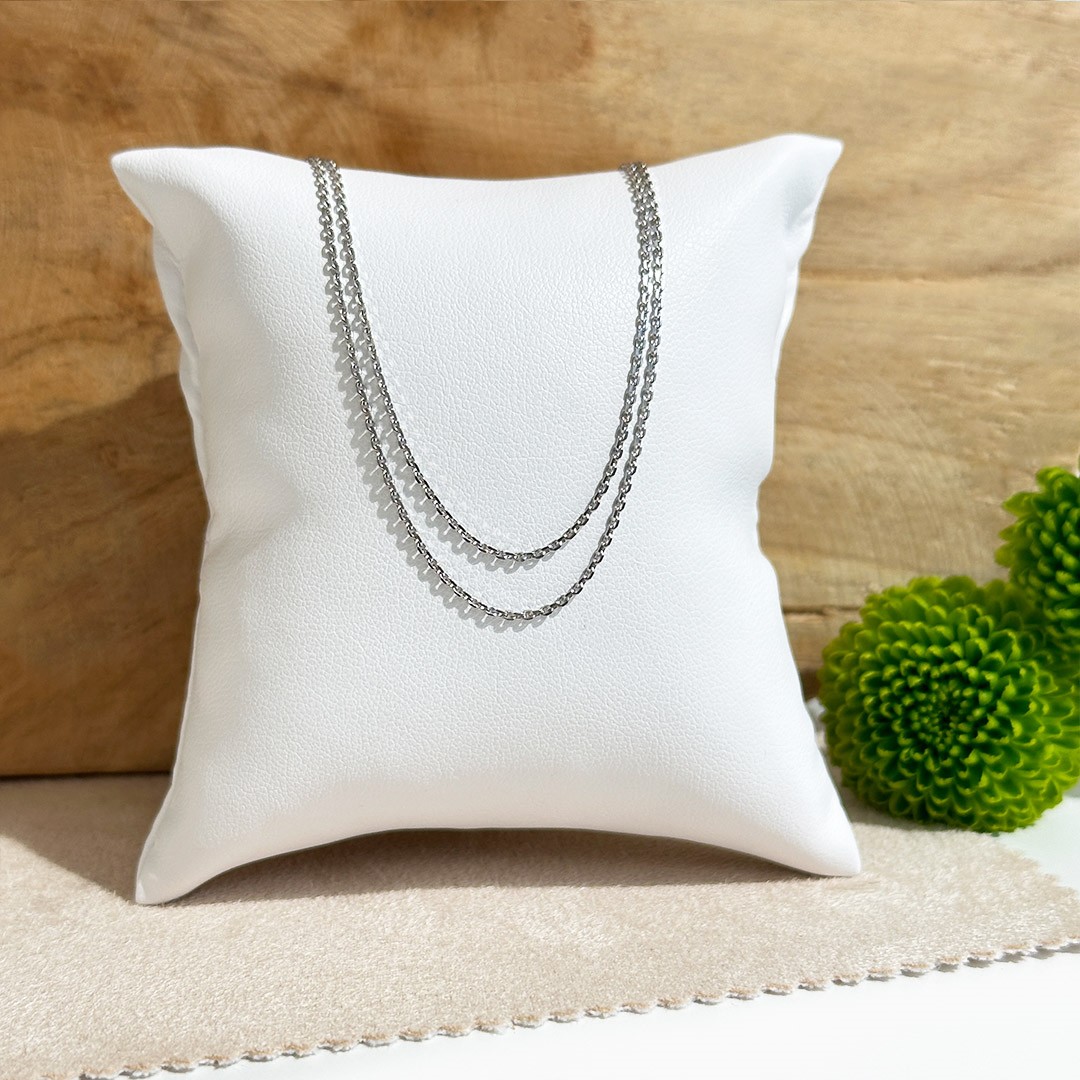 Diese Karreekette aus 585 Weißgold fasziniert durch ihr zweireihiges Design, das für eine außergewöhnliche Optik sorgt. Mit einer Länge von 45cm und einer Stärke von 1,2mm pro Kette liegt sie angenehm am Hals. Die facettierten, ovalen Glieder reflektieren das Licht besonders schön und sorgen für ein dezentes Funkeln. Diese Kette kann sowohl alleine getragen als auch mit einem passenden Anhänger kombiniert werden. Die Goldketten werden in Österreich gefertigt und sind in verschiedenen Goldlegierungen, Längen und Stärken erhältlich. Tipp zur Kettenlänge: Als Orientierung gelten folgende Standardlängen – für Damen meist 42–45cm, für Herren 50–60cm und für Kinder etwa 36–40cm.