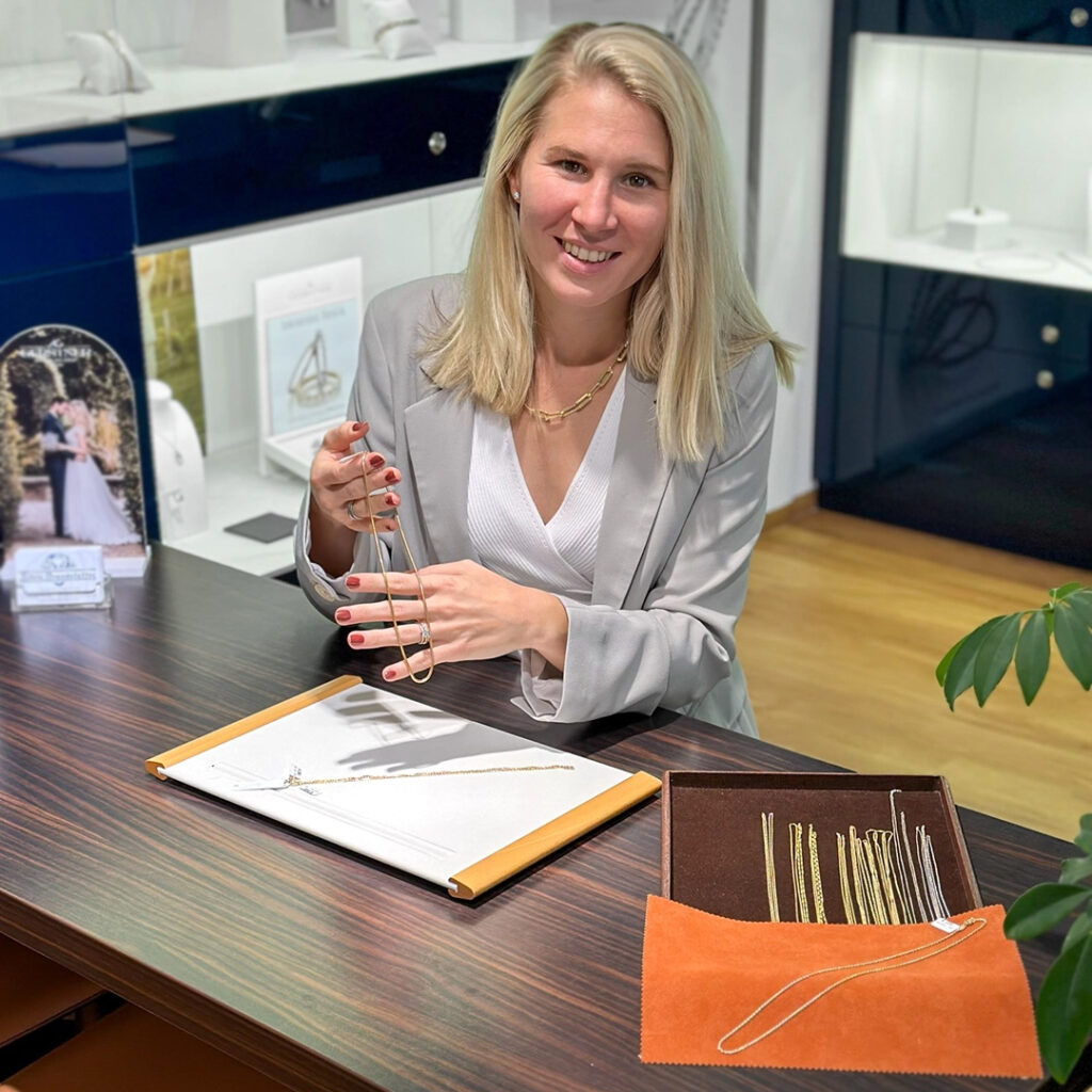 Ja, selbstverständlich. In unserem Fachgeschäft in Wien erwartet Sie eine große Auswahl an Goldketten, die Sie gerne anprobieren können. Wir nehmen uns Zeit, Sie bei der Auswahl zu begleiten und zeigen, wie unterschiedliche Längen, Stärken und Designs wirken. So finden Sie die Kette, die optimal zu Ihnen passt.