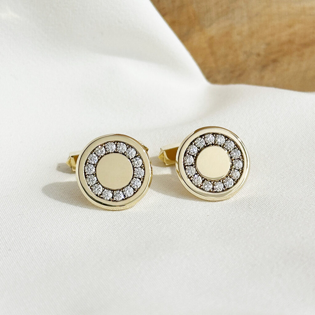 Wir fertigen Manschettenknöpfe auch mit fein gefassten Diamanten oder ausgewählten Edelsteinen. Die Besetzung kann dezent oder markanter ausfallen – je nach Stil und Anlass. Klassische Formen erhalten dadurch eine besondere Note und werden zu eleganten Begleitern für festliche Auftritte und besondere Anlässe.